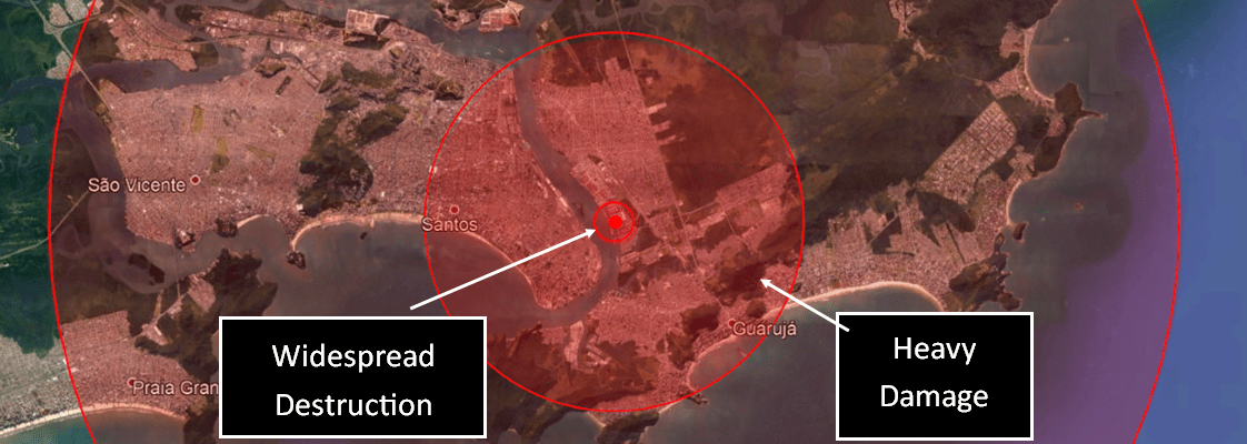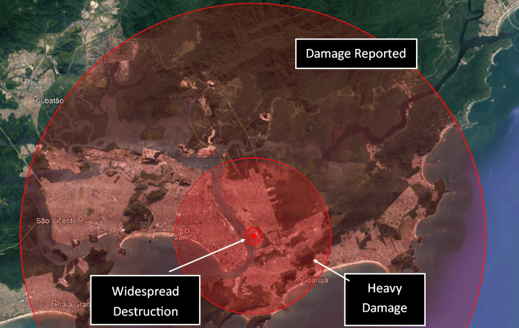 Most dry bulk terminals at the Santos Port are located along the left bank of the estuary (Guarujá). The blast would wipe out adjacent communities and cause major destruction in most of Santos and Guarujá. Adjacent cities such as Praia Grande and São Vicente would also be affected. However, many terminals are located further upriver (such a the ones along the Piaçaguera canal) and would likely remain online after minor repairs.