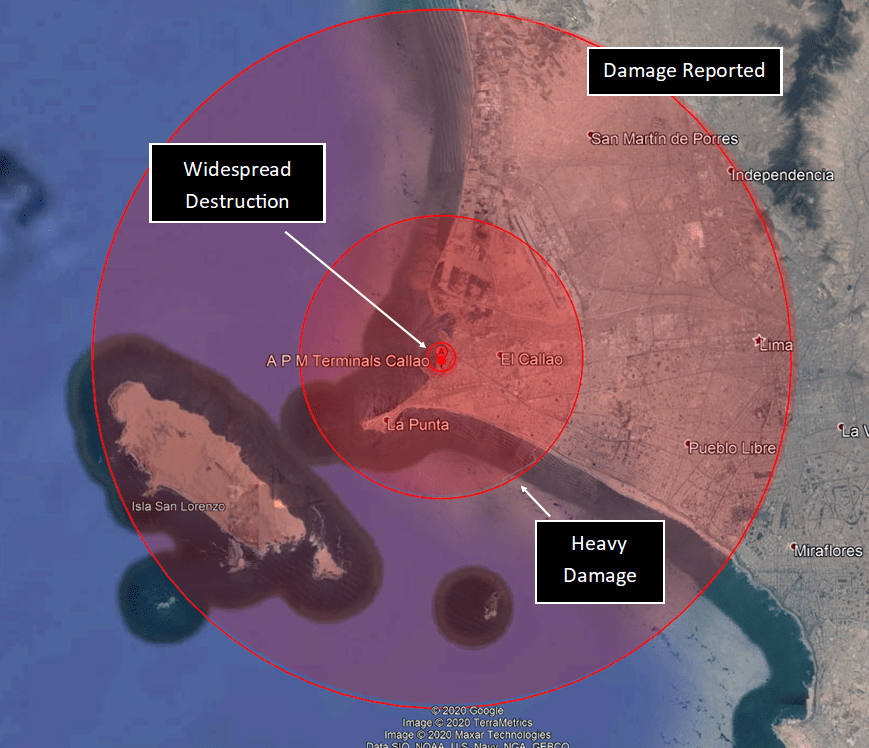 The blast would cause heavy damage to Callao itself, as well as considerable effects on Peru’s capital, Lima. However, the city’s vast expanse would render many areas undamaged, including the affluent Miraflores. The San Lorenzo island, a wildlife sanctuary, would likely suffer loss of life too.