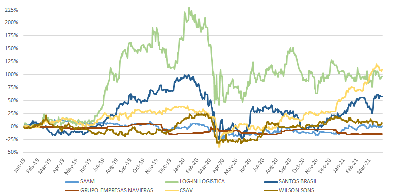 CSAV’s performance is directly linked to the spectacular growth experienced by Hapag-Lloyd’s shares, which in turn is associated with the container freight rates going through the roof since mid-2020. The stock is currently the only alternative for investing in deep sea shipping in Latin America. EBITDA was USD 302.8m in 2020, with net income reaching USD 222.1m.