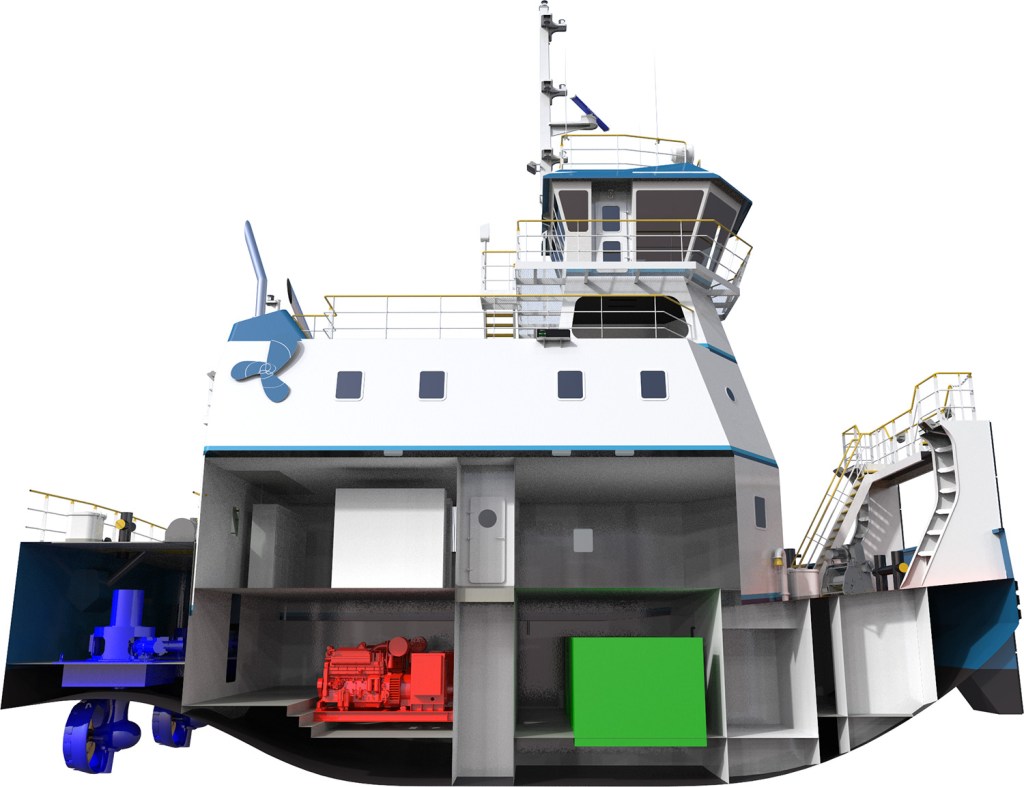 The new pushers are of the RApide 2000-E design, fitted with a DC grid diesel-battery electric propulsion system, two diesel generators, a large battery bank (600 kWh initial installation, with capability to scale up to 1800 kWh), and two L-Drive units, each with an input power of 350 kW.