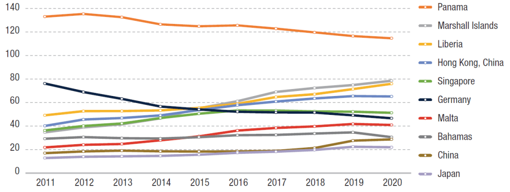The UNCTAD report has also assigned carbon emissions to flag states for the first time. Although Panama is the leader, there is a clear downward trend. On the other hand, the Bahamas flag emissions have not changed much over the last 10 years. The sharp 2020 reduction over 2019 is due to the Covid-related cruise industry shutdown.