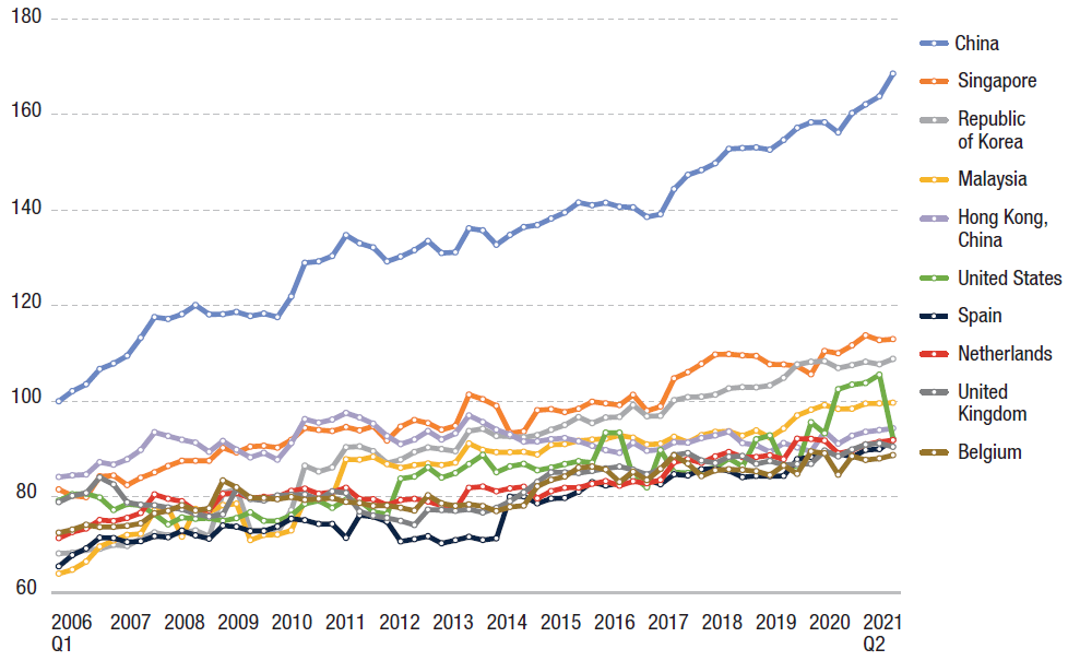 All top 10 countries worldwide, however, have an LSCI above 80, with China widening its lead over the years.