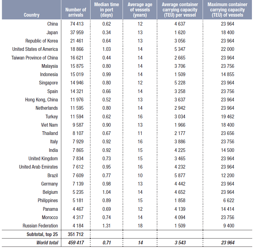 The report showed a variety of new key performance indicators (KPIs) for ports. For example, median time in port for container ships (0.71 days) is a third of time in port for dry bulk carriers (2.07 days). Looking at countries, with 74,413 container vessel arrivals, China has almost double the port calls of the second place, Japan (37,969 calls). However, Japan boasts the lowest median time in port (0.34 days, or just 8 hours).